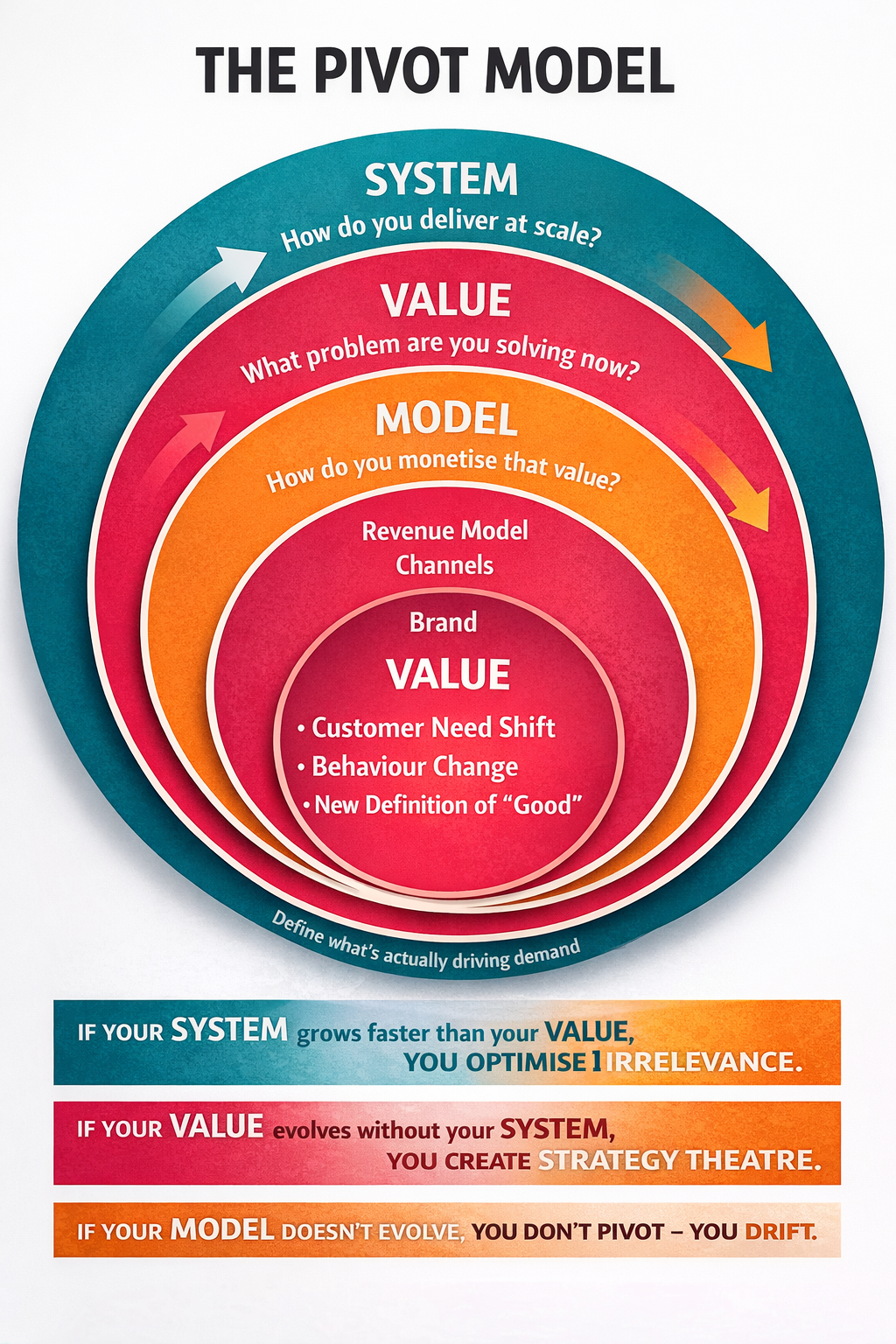 A pivot is not a rebrand or a campaign. It is a deliberate shift in how you create, deliver, and capture value. This is the true skill of Marketing as a function if you give them space to do this. Portfolio strategy and management are essential.